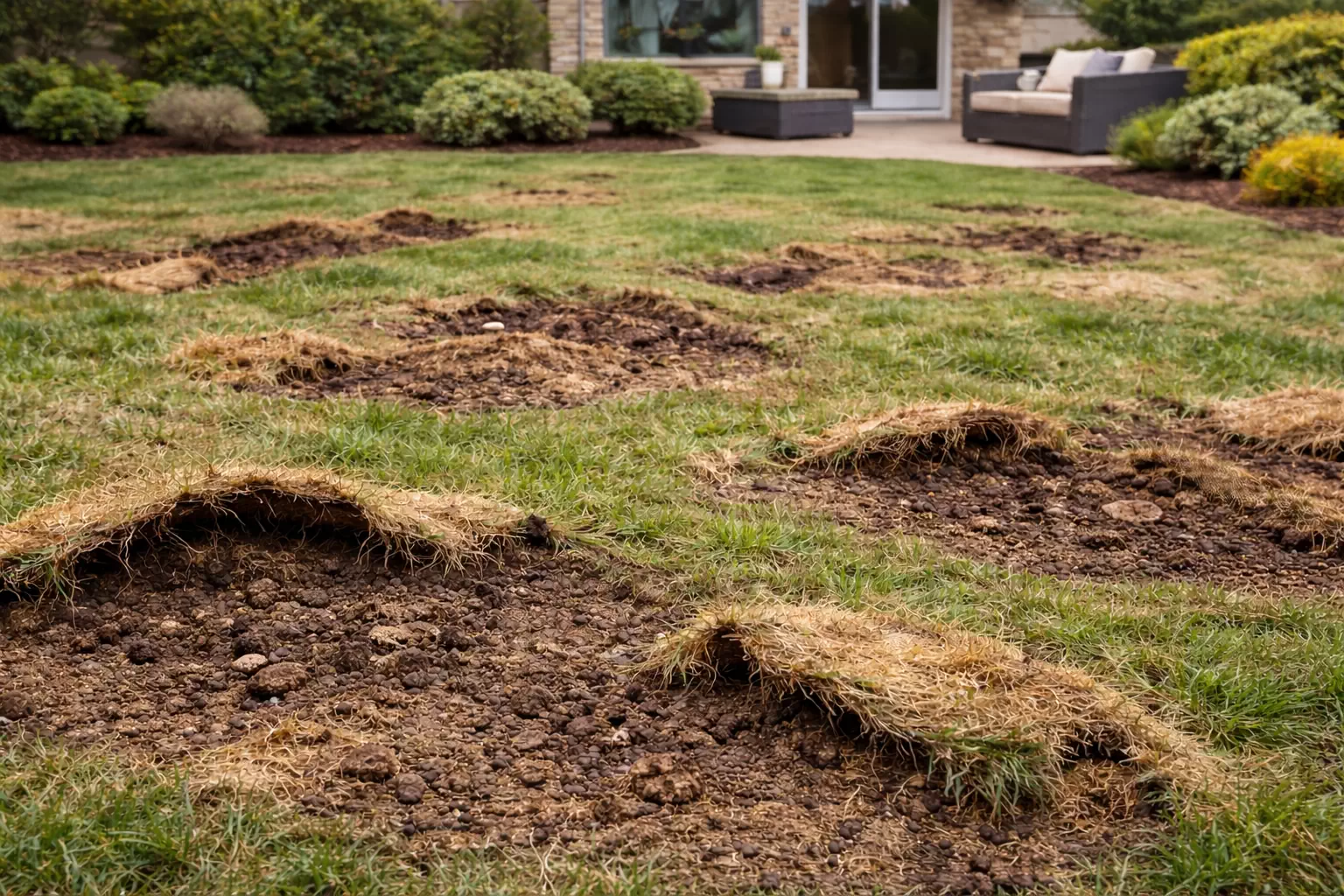 - Wildlife such as raccoons and skunks may dig into lawns while searching for larvae.
